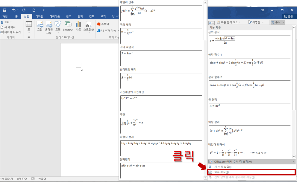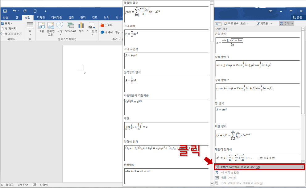 를 클릭하면 아래와 같은 Office에서 기본으로 제공하는 수식들이 뜨는데, 이 것이 바로 첫 번째 Tip입니다.