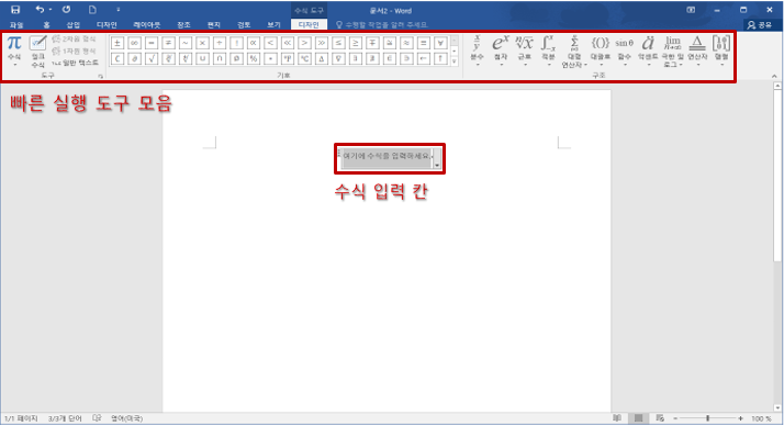 그러면 아래의 그림처럼 수식 입력 칸이 뜨고, 빠른 실행 도구 모음이 바뀝니다. 필요한 수식을 찾아 삽입하고 그곳에 원하는 값을 입력하면 워드에서 수식 넣기는 완성!