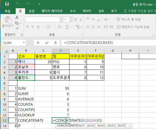 CONCATENATE 함수는 원하는 위치의 텍스트들을 붙여주는 기능입니다.