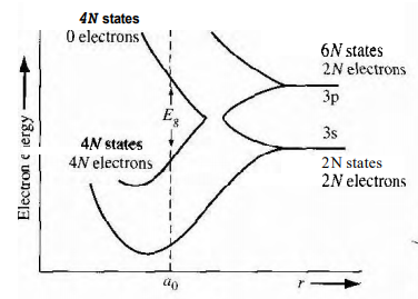 4개의 가전자 중 3s2개는 완전히 채워져 있고 2개의 양자상태를 가지며 3p2개는 원자당 6개의 양자상태를 가집니다. 두 개 이상의 실리콘 원자들이 서로 가까워지면 3s 3p가 상호작용하고 중첩됩니다. 평형상태의 원자 간 거리에서 밴드는 분리되고 원자당 4개의 양자상태는 낮게, 4개의 양자상태는 높게 분포됩니다. 0K에서 전자들은 가장 안정한 상태를 가지고 이때 낮게 위치한 밴드는 가전자대(valance band, Ev), 높게 위치한 밴드는 전도대(conduction band, Ec)라 부릅니다. 가전자대와 전도대 사이의 에너지 간격을 밴드갭(bandgap, Eg)이라 부르고 이는 금지밴드의 폭에 해당합니다.