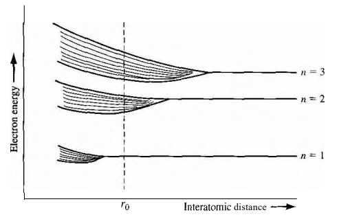n=3인 원자를 예로 들어 봅시다. 두 개의 원자들이 서로 가까워지면 최외각(n=3)부터 상호작용을 시작하게 되어 불연속 에너지 준위가 에너지 밴드로 형성됩니다. 다음으로 n=2  그리고 마지막 n=1도 에너지 밴드로 형성됩니다. 원자가 일정한 간격을 가지고 배열되게 되면 전자들은 아래 그림과 같이 금지 밴드(forbidden band)로 분리된 허용 밴드를 가지게 됩니다.