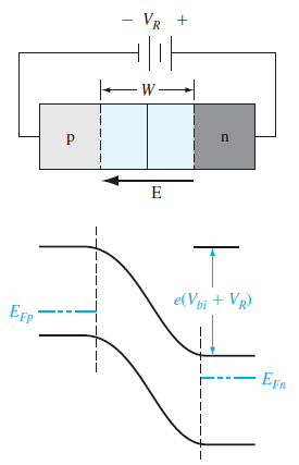 pn 접합의 에너지 밴드 다이어그램을 살펴봅시다. 각 전도대와 가전자대의 에너지는 공핍 영역을 통과할 때 p-type과 n-type의 상대적인 페르미 준위 차이로 인해 휘어지게 됩니다. 이로 인해 n영역의 전자가 p영역으로 넘어가기 위해서는 장벽을 넘어야 하는 상황이 옵니다. 이 장벽을 내부 전위 장벽(built-in potential barrier)라고 부르고 Vbi로 표기합니다.