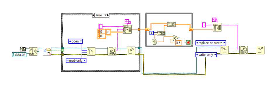 이제 생성된 파일을 불러와 누적하여 데이터를 입력하는 케이스 구조의 True 값을 작성해야 합니다.