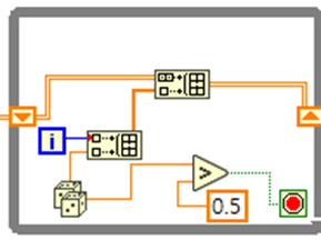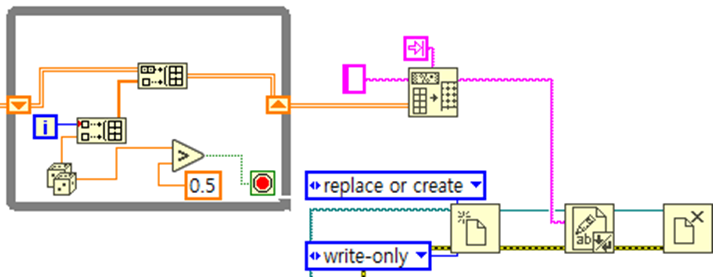 저번 강의처럼 While 문의 시프트 레지스터(Shift register)를 이용하여 랜덤 값이 0.5 초과될 때 까지 횟수와 난수를 기록해보겠습니다.